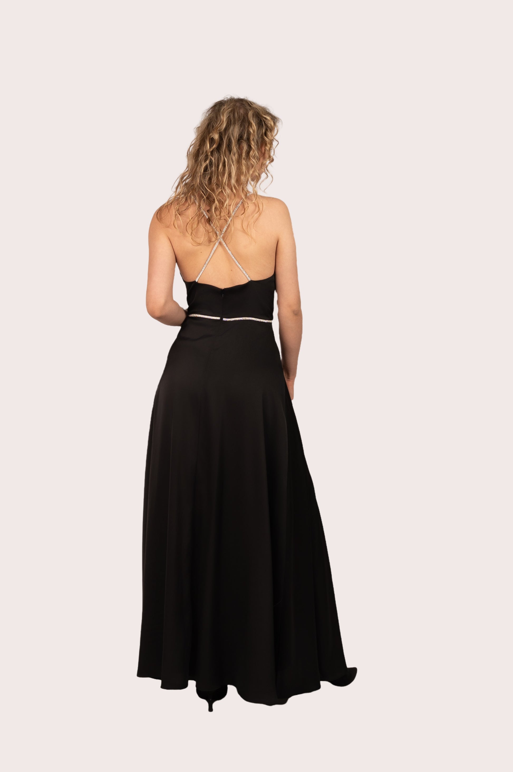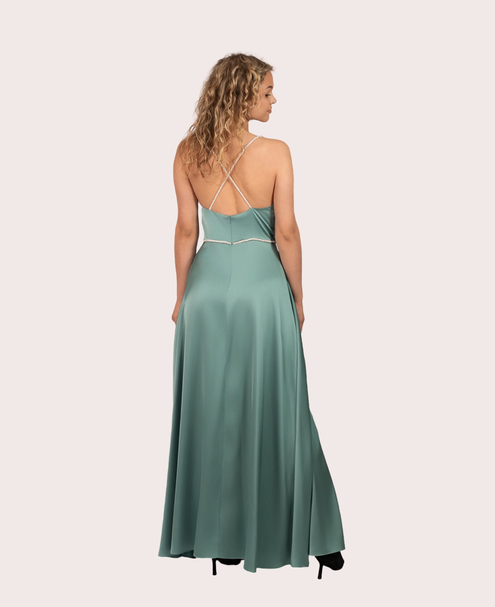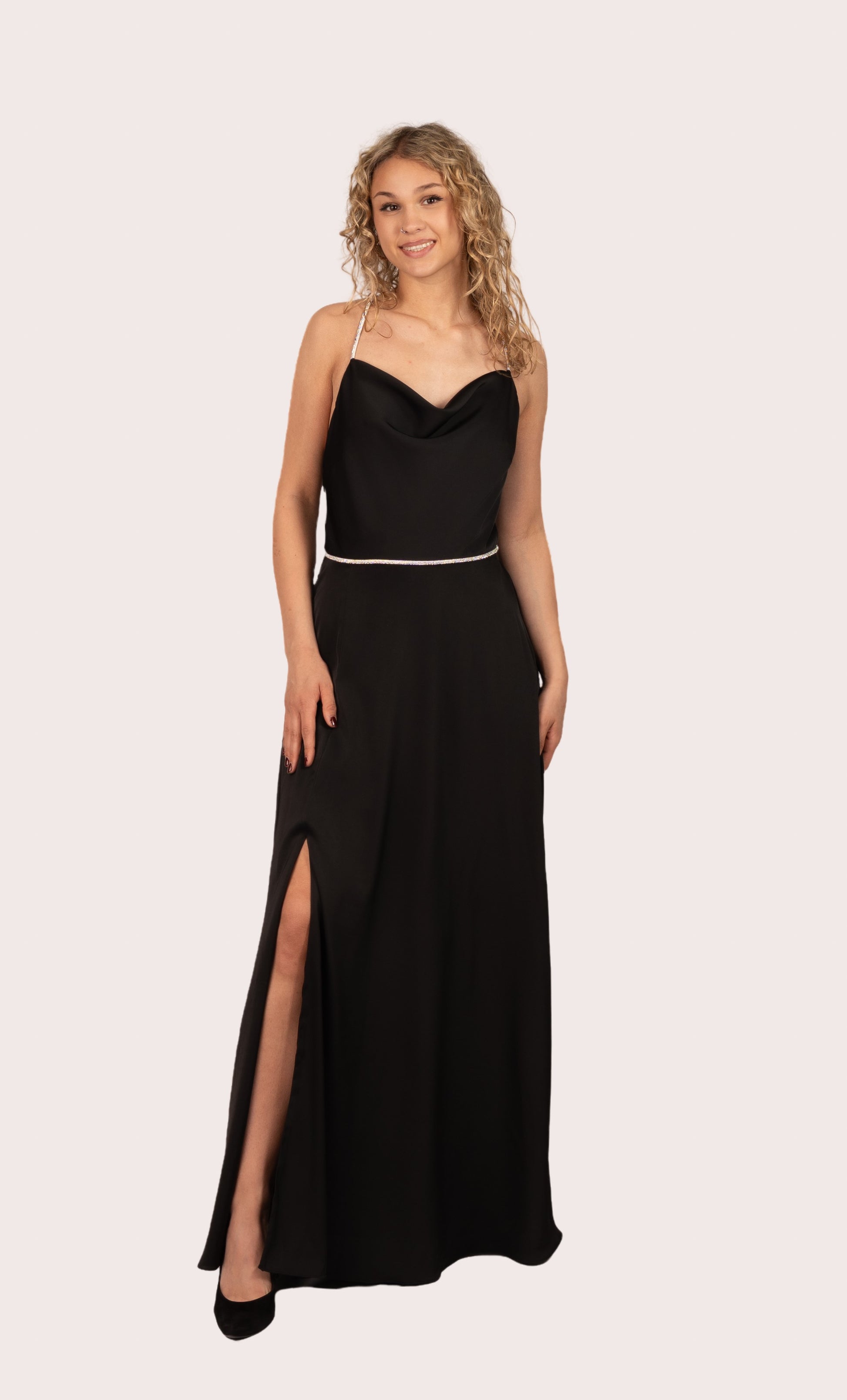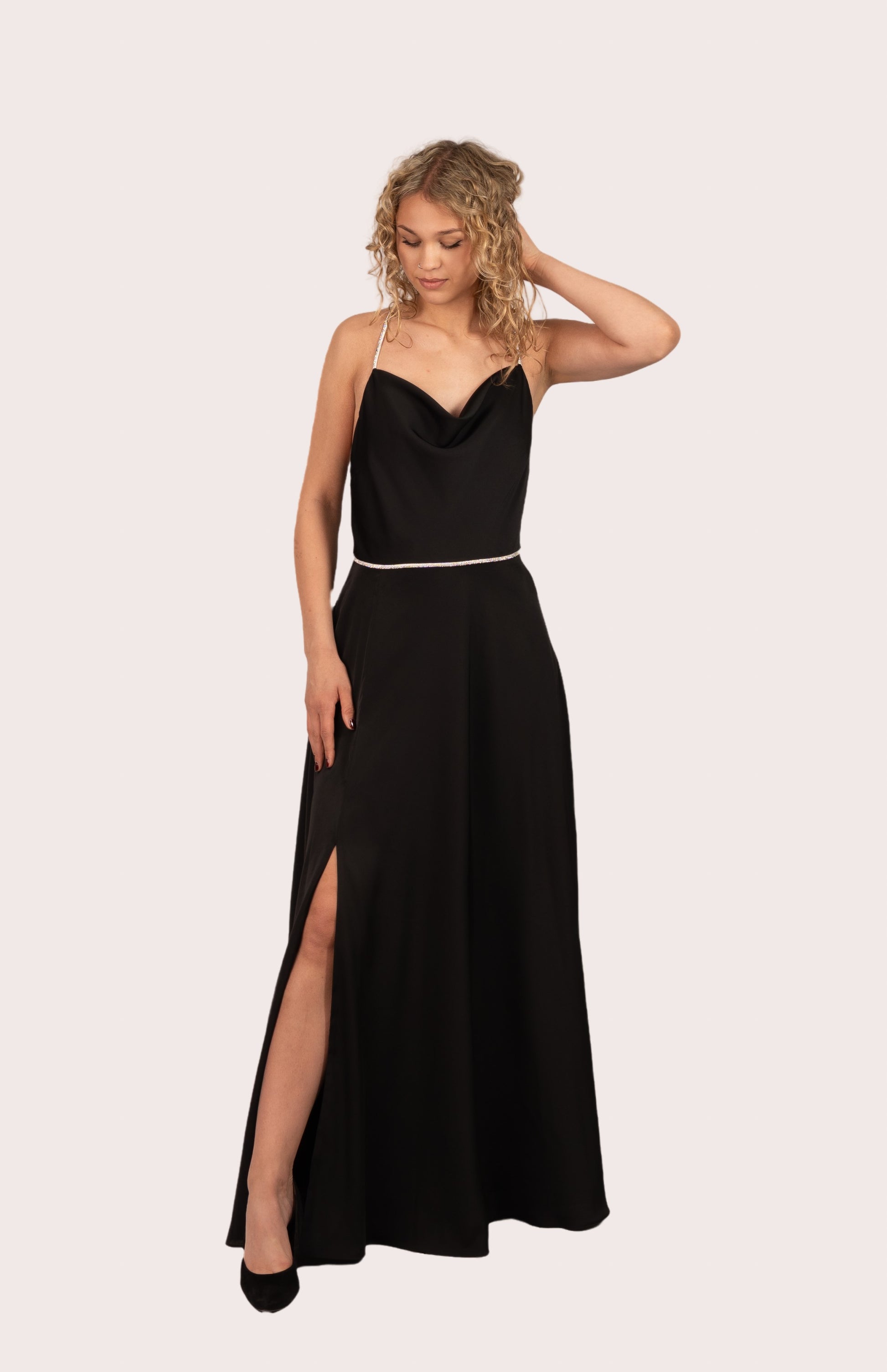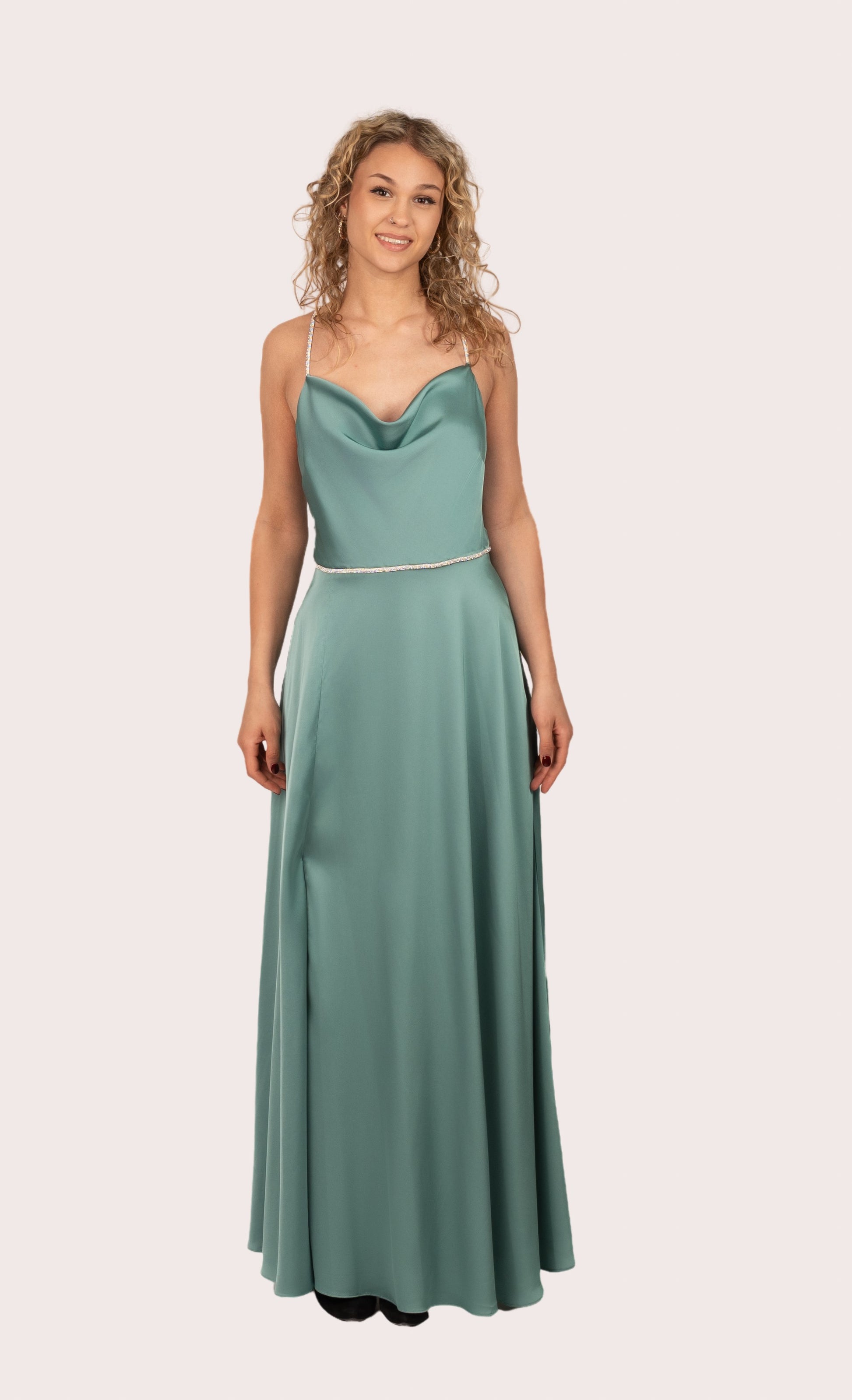 Langes Satinkleid, Spaghettiträger mit Kristallsteinen verziert, Wasserfall-Ausschnitt Reißverschluss hinten, Schlitz
